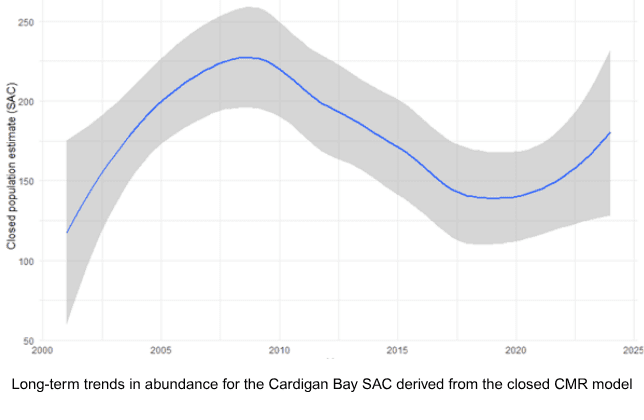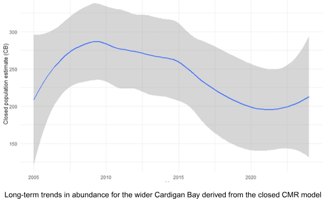 Abundance estimates have varied over the years, within Cardigan Bay SAC rising from around 120 in 2001 to a peak of c. 225 in 2008, followed by a decline to around 140 in 2020, since when there has been a corresponding increase. In 2024, we estimated a population of c. 230 individuals within this SAC whereas a smaller number inhabits the neighbouring Pen Llŷn a’r Sarnau SAC in northern Cardigan Bay.