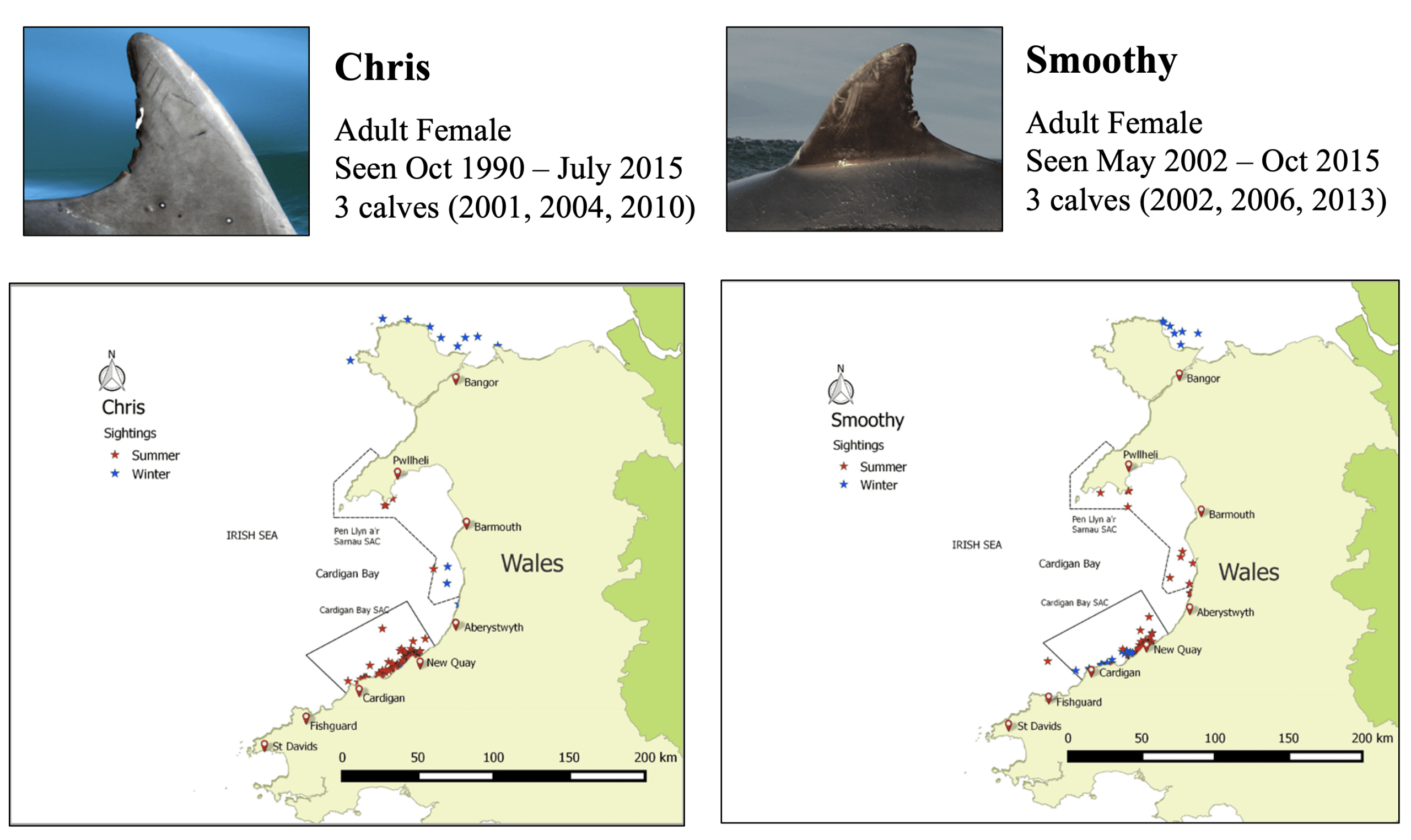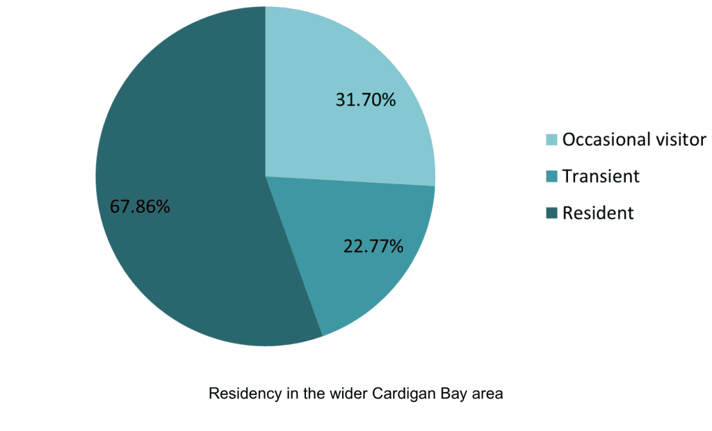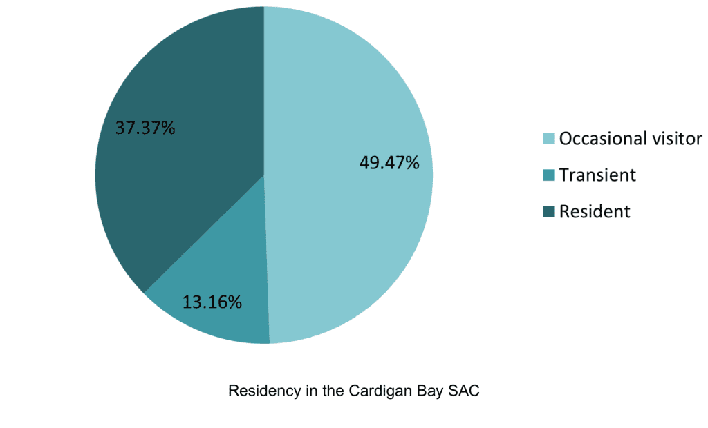 The Cardigan Bay population comprises a mixture of residents, occasional visitors and transient individuals, the majority (ca. 60%) being classed as residents. Animals that have been recorded over more than seven years are considered residents, whereas occasional visitors are individuals that are typically sighted only every one or two years, and transients are animals that have only been recorded once or twice throughout the length of the project.