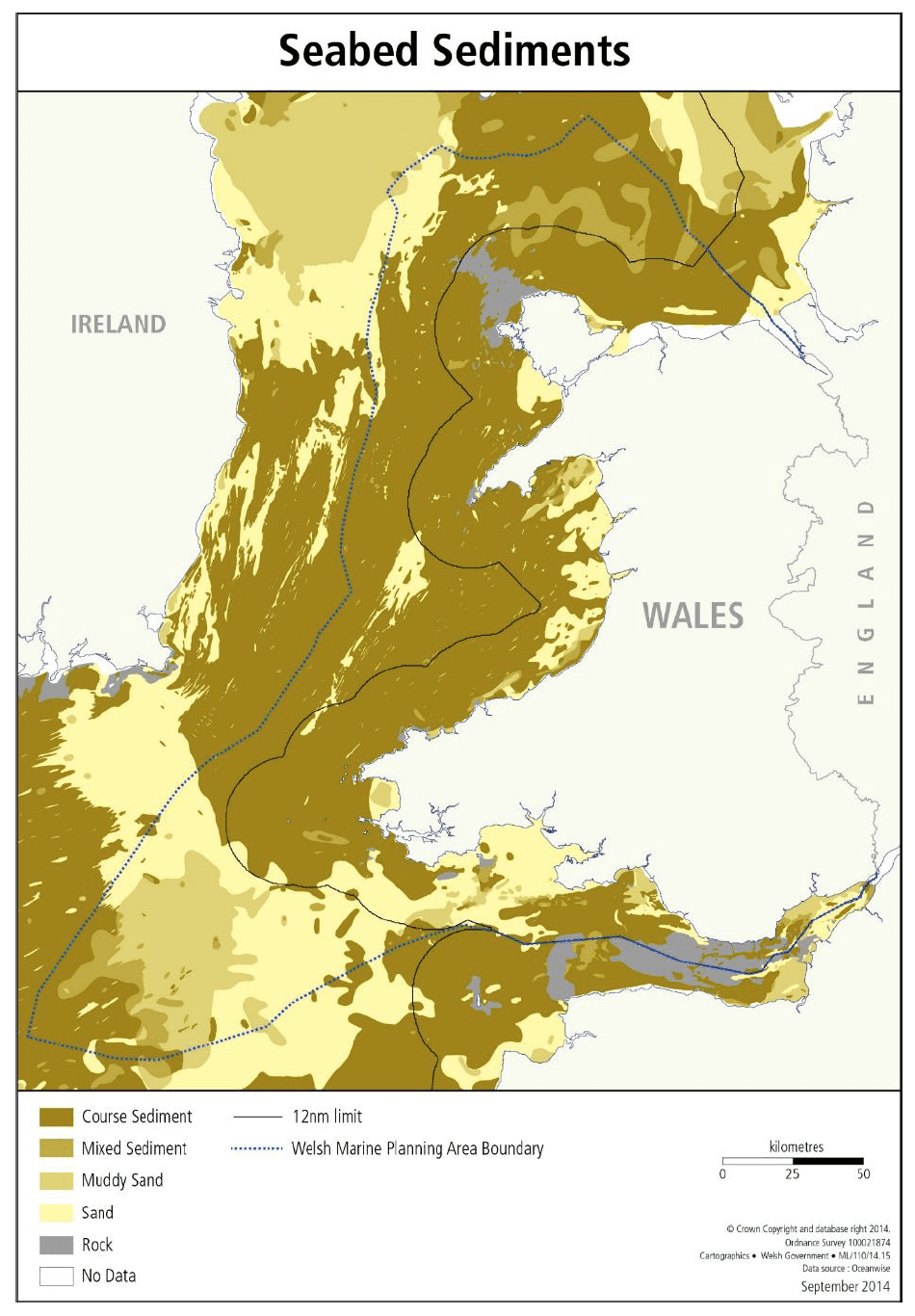 Seabed sediments of the Irish Sea.