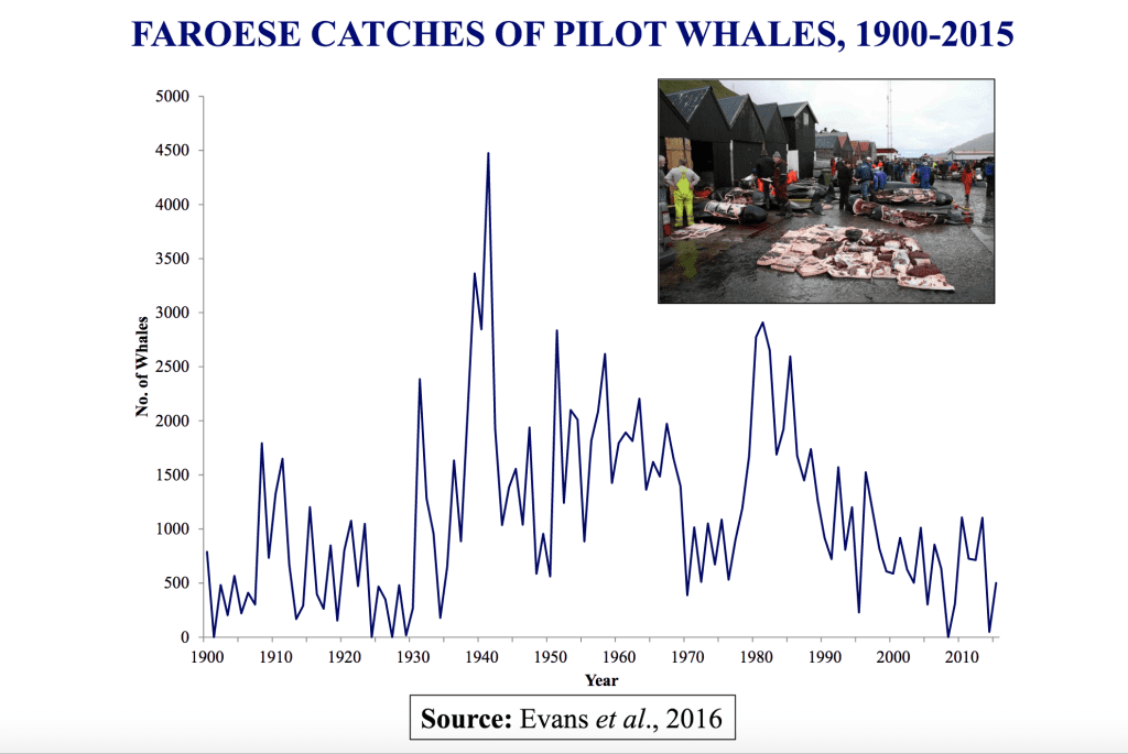 Images: 1) Pilot whale drive in the Faroes; 2) Numbers off pilot whales taken in the Faroes; 3) Whaling vessel in Iceland, photo credit: Sea Shepherd UK); 4) Flensing a blue-fin whale hybrid in Iceland; 5) Norwegian catches of minke whales