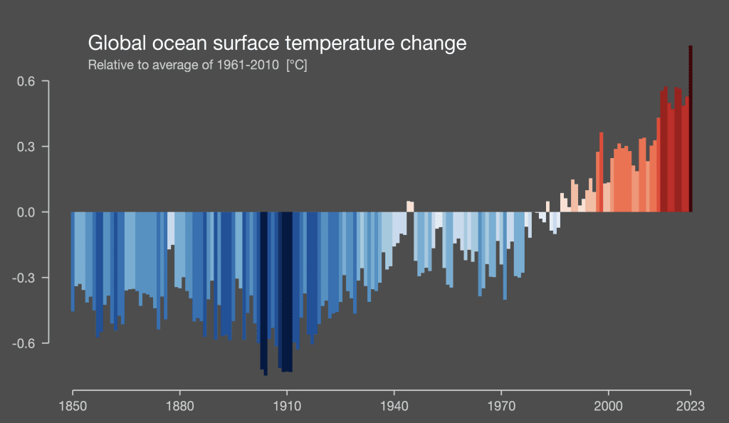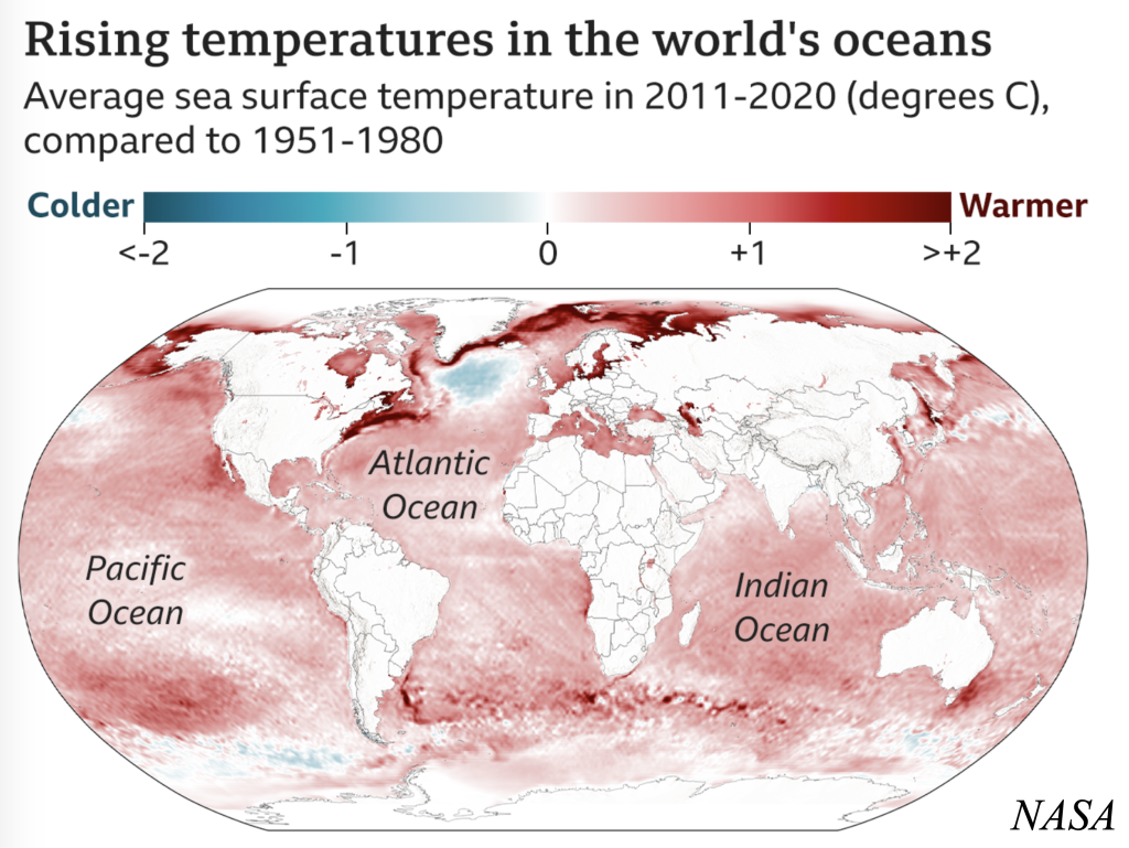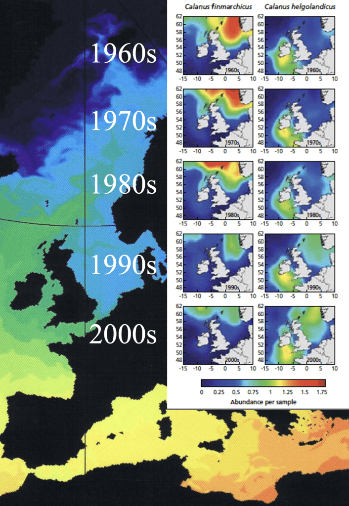 Images: 1) Global increase in sea temperatures; 2) Global variation in sea temperature rises; 3) Effects of Year, Sea temperature, North Atlantic Oscillations, and Atlantic Multidecadal Oscillations on the densities of four cetacean species in European Seas; 4) Planktonic changes over time; 5) Polar Bear – a victim of climate change