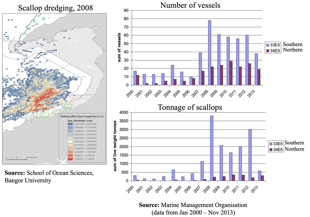 Images: 1) Declines in Herring & Mackerel landings; 2) Increases then declines in Sprat, Norway Pout & Sandeel landings; 3) Increase in Scallop dredging in Cardigan Bay; 4) Areas where bottom dredging for scallops was most intense; 5) Trawler