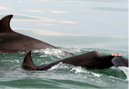 Images: 1) Boats disturbing bottlenose dolphins; 2) Jet skis; 3) Speedboat; 4) Bottlenose dolphin vessel strike victim; 5) Harbour porpoise with propeller cut, photo credit: CSIP