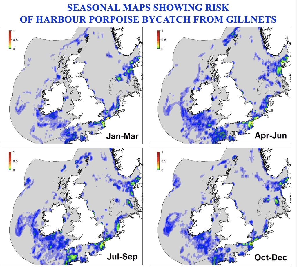Images: 1) Harbour Porpoise, photo credit: F Hobson); 2) Atlantic White-sided Dolphin, photo credit: P Watkinson; 3) Minke Whale, photo credit: R Dyer; 4) Grey seal, photo credit: BDMLR; 5) Harbour Porpoise bycatch risk maps