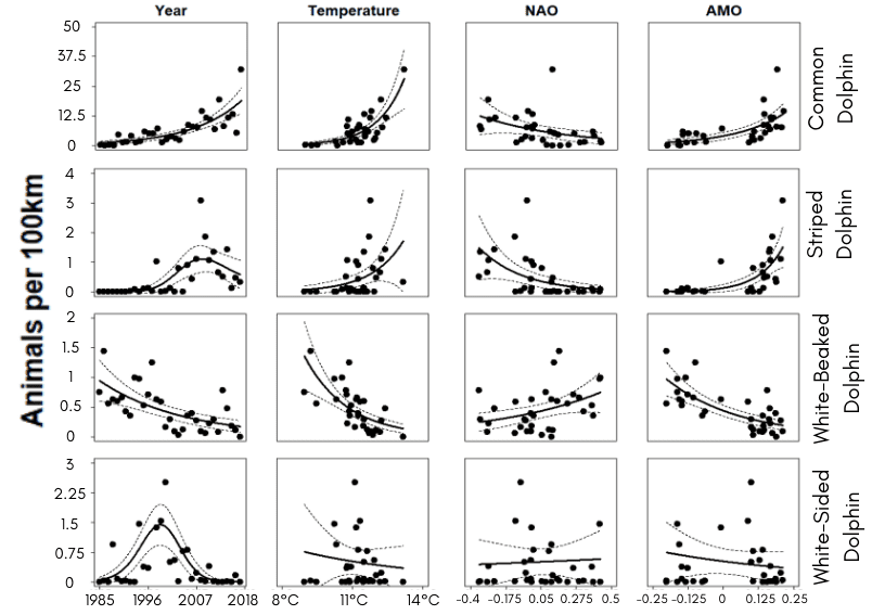 Climate change due to anthropogenic causes poses several possible threats to cetaceans. Obvious consequences will be the increase in sea temperature and the subsequent melting of polar ice and drowning of coastal plains, along with changes in levels of primary productivity, which could severely affect the prey distribution of marine mammals. Other less direct implications include an increase in the frequency and velocity of storms; severe storm events could cause substantial physical damage to habitats and species. The distribution of many marine mammal species may be affected by the shifts in areas of primary productivity and prey distribution caused by climate change. In the UK, warmer water species such as striped dolphin and Cuvier’s beaked whale are occurring more frequently on the west coast and common dolphins into the northern North Sea whereas Atlantic white-sided and white-beaked dolphins may be shifting their range northwards. Some species, such as land-breeding pinnipeds and coastal cetaceans, may find it difficult to adjust to the loss of important feeding or breeding habitat due to changing temperatures. On a global scale, predictions are that cold-water species will shift towards the poles and therefore result in the reduction of their global range.