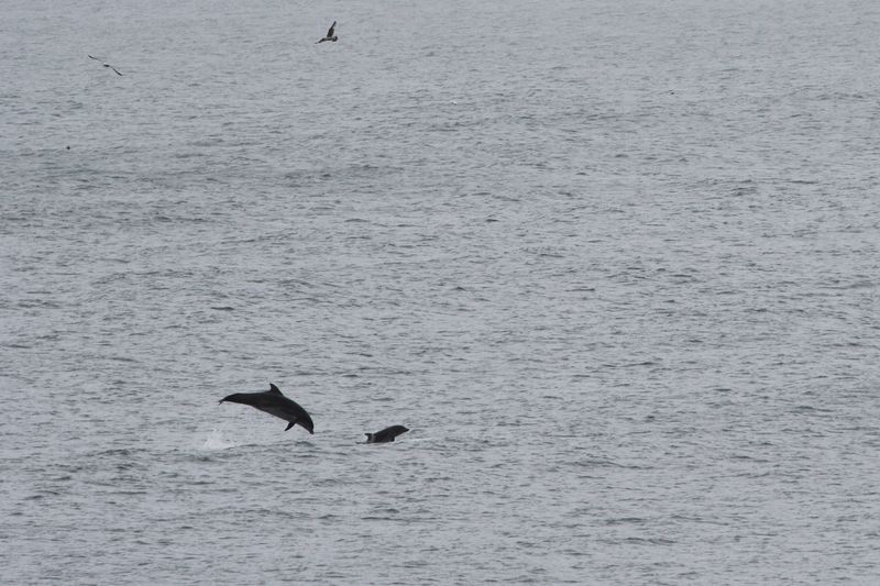 This week, a call for help resulted in a very exciting sighting. Our intern, Sean, called in alerting us to the presence of spectacularly leaping dolphins near the fish factory. I hurried out, keen to photograph the spectacular leaps, but mainly hoping for some photo-identification shots. Once I arrived at the fish factory, the excitement had died down a bit but I quickly spotted 5-6 dolphins, probably 3-4 adults and 2 juveniles, feeding intensely while being closely followed by a flock of gulls. And suddenly there was a flash of cream before I saw a tiny fluke disappear under the water. A very young calf, tiny compared to the adults around it, was eagerly trying to keep up with its mum and attempted a leap of its own. Judging by its size and the prominent stripes on its side, this was a very young animal, probably born this season. The group continued to feed for a while and I was able to observe it close hand. Its mum seemed quite relaxed and the calf wandered off on its own a few times, making exploratory leaps and on one occasion, swimming on its back- clearly this whole swimming business was still a novelty!