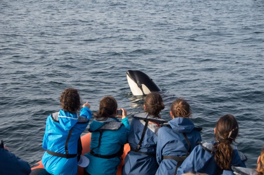 After analysing the situation, divers and workers of two boat tours companies began to try to save the animal. Even though they could cut the pieces of net from the body, the fluke was still trapped in it. After some time, they were able to bring the orca on board of the boat and finally cut all the remaining fishing net that was around it. When the calf was released it reunited with the rest of the pod, that was, as it usually does in this time of year, moving west. The young cetacean was tired and scared, but was closely guarded by 3 adult orcas, that stood by it while the rescue mission was taking place.