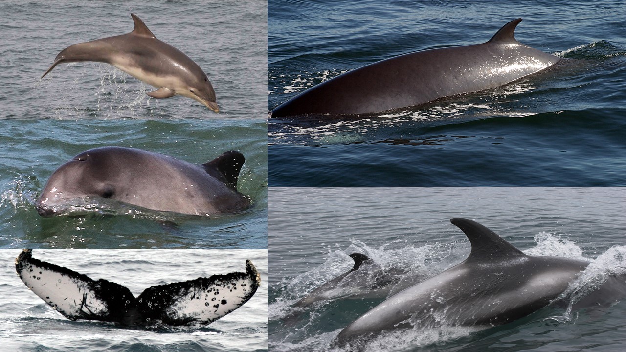 From left to right: Bottlenose dolphin (BND), County Mayo, Ireland; minke whale (MW), Isle of Eigg, Inner Hebrides; harbour porpoise (HP), Anglesey, North Wales; white-beaked dolphins (WBD), Aberdeen, Scotland; humpback whale (HW), Isle of Lewis, Outer Hebrides. Photo credits: (BND) Pia Anderwald/ SWF, (MW) P.G.H. Evans/SWF, (HP) P.G.H. Evans/SWF, (WBD) Caroline Weir, (HW) P.G.H. Evans/SWF.