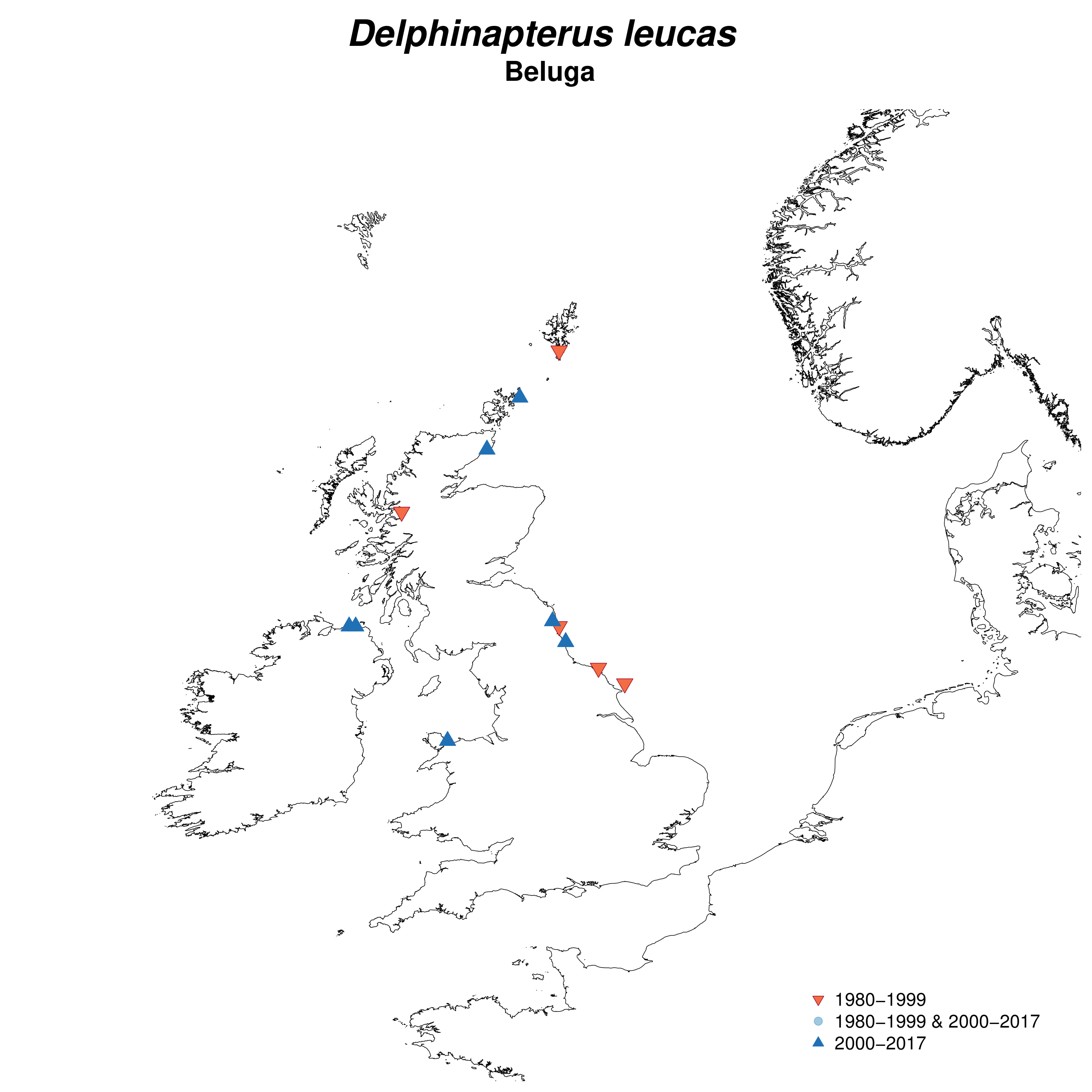 Map showing Beluga whale sightings in the UK over the past fifty years (Source: Sea Watch Foundation).