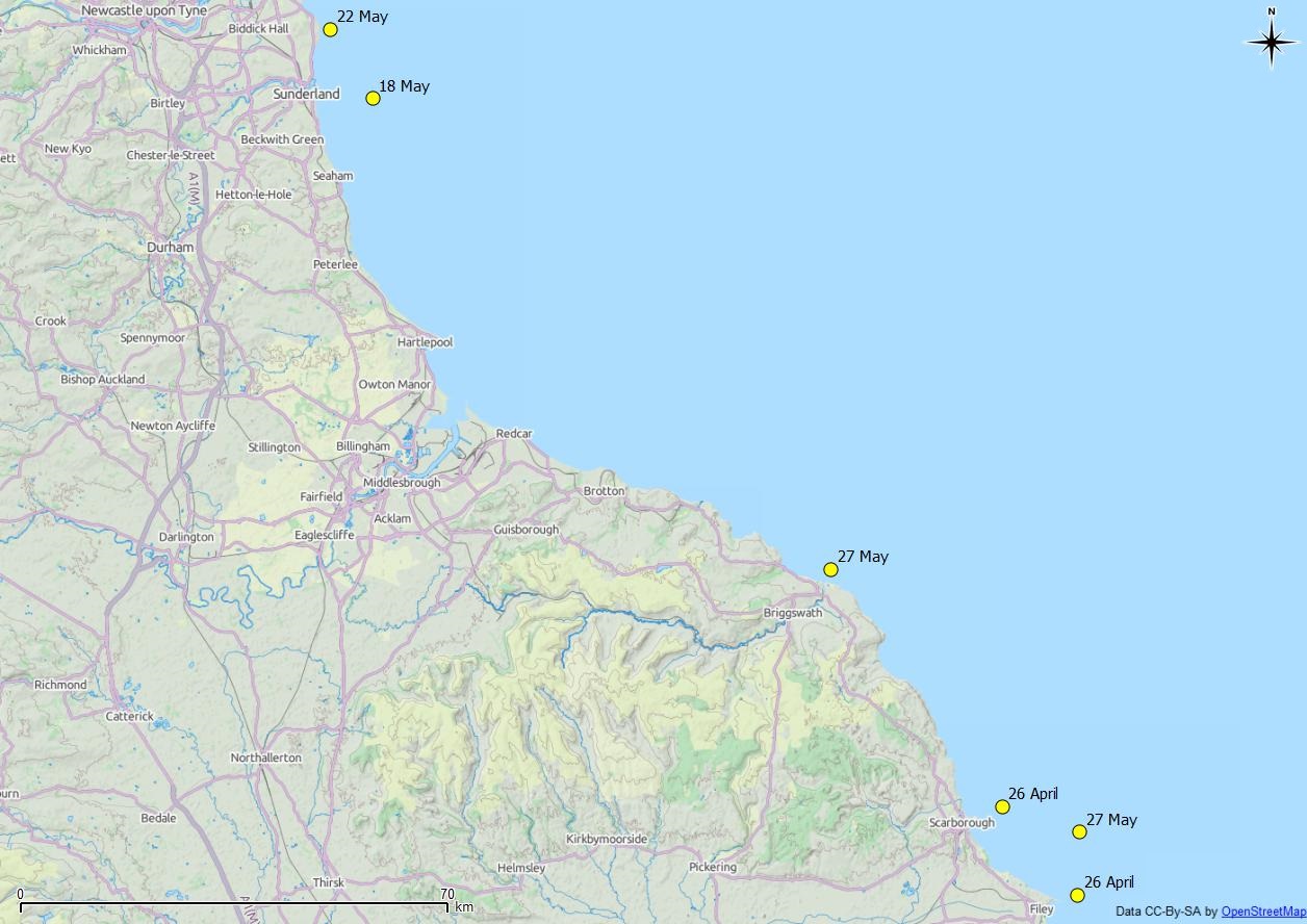 The first bottlenose dolphin sighting reported in the North East of England this ‘season’ was at Tynemouth on the 12th of April. After visiting Yorkshire, the dolphins returned to Sunderland on the 18th of May, and then made their way to Whitburn, where they were sighted on May 22nd. On the 27th of May, a group consisting of about 15-20 individuals was observed from the Mary Ann Hepworth tour boat and appeared to be engaging in foraging behaviour. The sighting took place approximately half a mile off the pier at Whitby, and the group was seen heading east towards Scarborough.