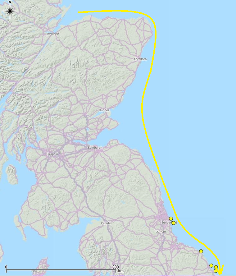 Map displaying probable route taken by the dolphins while travelling from Moray Firth (top) to the Yorkshire coast.