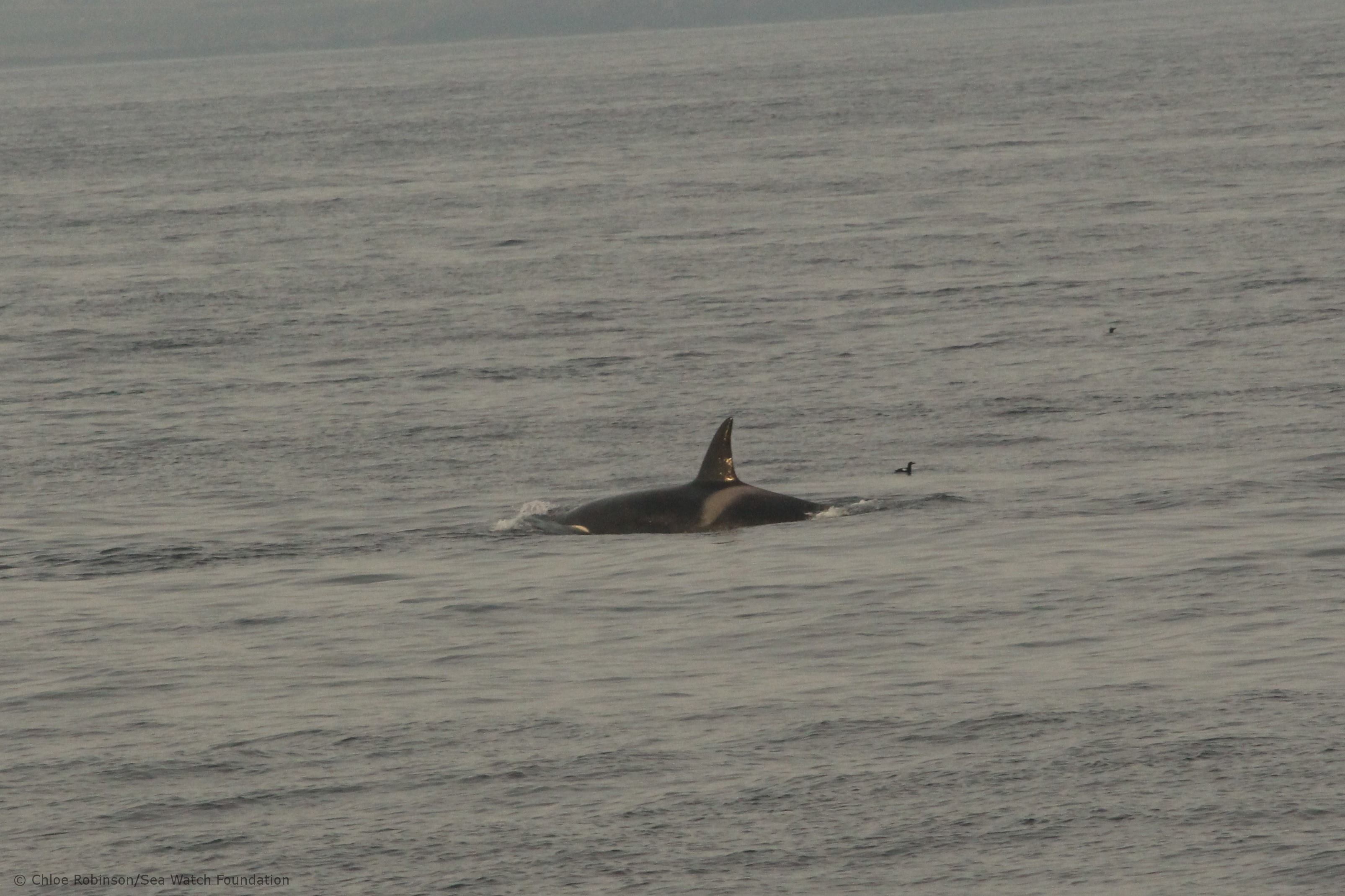 As the last ferry left Burwick and headed back to John O’ Groats, the sea was a lovely and calm and the haar had all but vanished, leaving behind a beautiful sunset over Stroma. Observer Steve Truluck received a call from an orca watcher at Duncansby Head who told him there were orca heading straight for us! After some clarification on where the killer whales were and where they were heading, we managed to see some orca through the binoculars heading north east on the edge of what remained of the haar. What we didn’t realise is that due to a miscommunication we actually had managed to spot an entirely different group of killer whales to what watchers at Duncansby Head were seeing. After catching up with this group of four animals (one a youngster!) and attempted some photo ID shots, we headed back towards John O’ Groats, entirely unaware that another group of killer whales were heading towards us. Moments later, skipper Ivor received a phone call alerting us to the killer whales and before we knew it they were right off the front of the boat – we managed to count around 5 individuals before they dived below us and continued up towards Scapa flow.