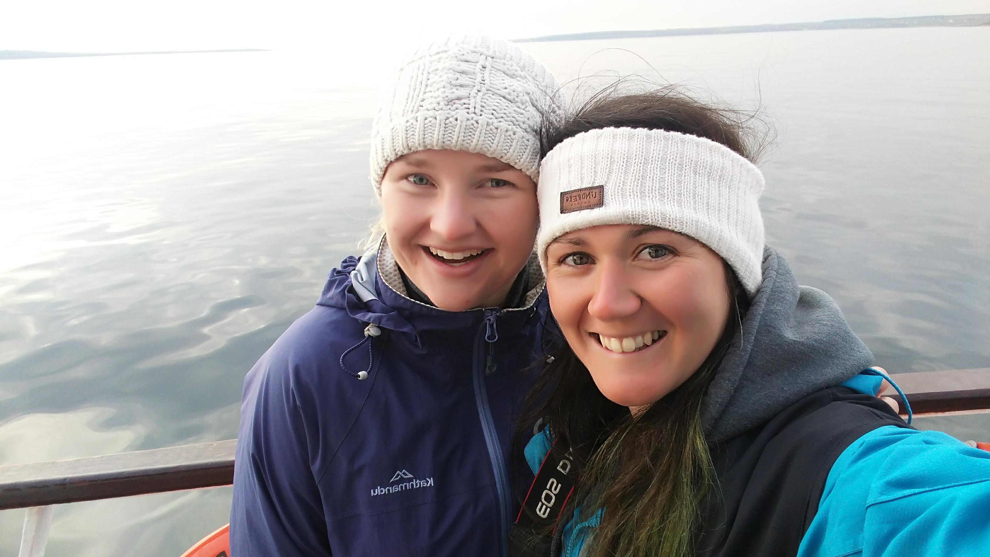 Tara Callahan and Chloe Robinson full of energy and excitement for the sighting of orcas on-board the John O’Groats ferry boat.