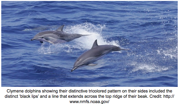 The first Clymene dolphin was described in 1846 and then confirmed as a species in 1981, Stenella clymene. However it wasn’t until recently that genetic studies recognised this dolphin as a hybrid between the striped (Stenella coeruleoalba) and the spinner (Stenella longirostris) dolphins. It had long been noted that its appearance and behaviour was closer to that of the latter species but its cranial features were similar to that of S. coeruleoalba.