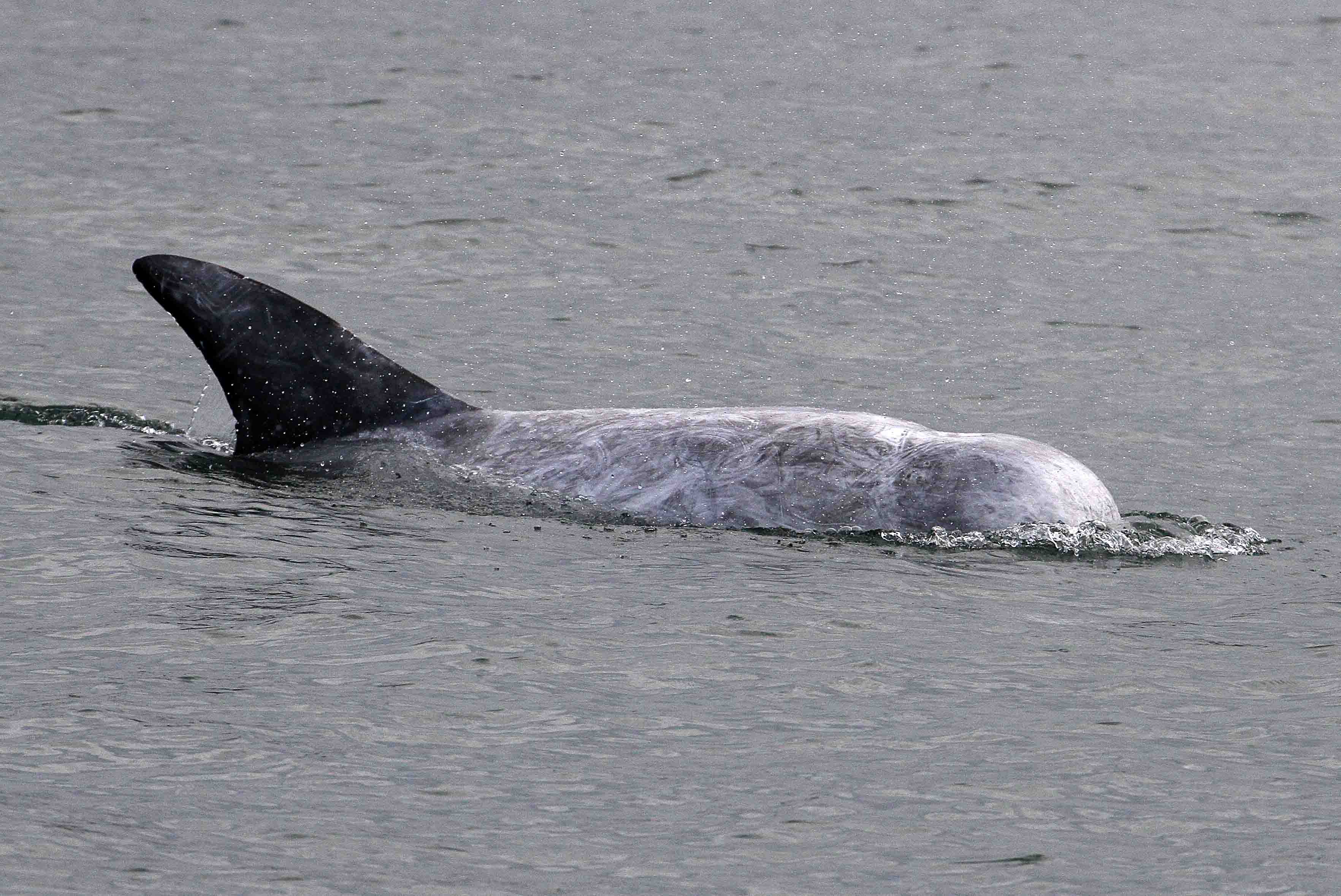 One of the Anglesey Risso’s dolphins displaying its blunt head and white colouration. Photo by Dr Peter Evans.