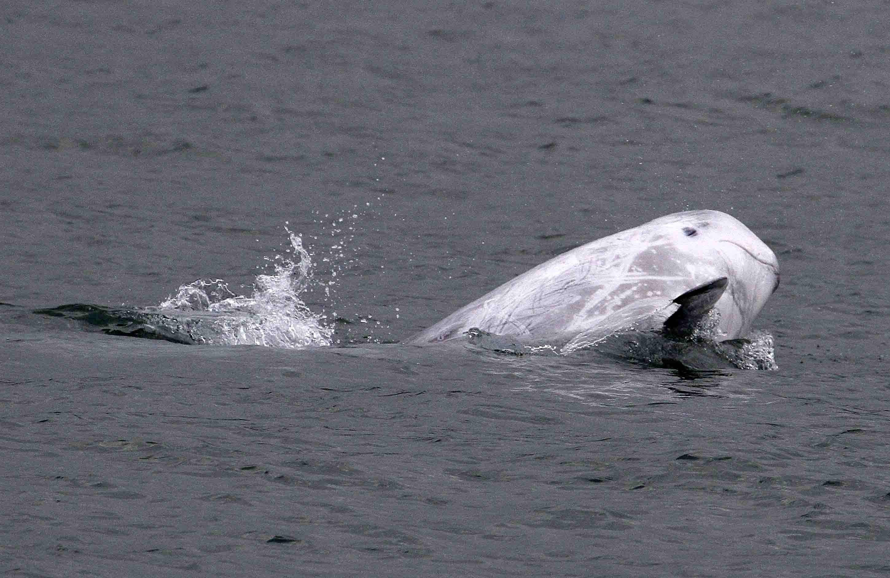 “Many of the dolphins were younger animals, much darker than the mature white individuals,” said Dr Evans. “These were engaged in lots of playful behaviour, swimming in a tight bunch often in direct contact with one another. The dolphins showed some segregation by age with younger animals forming separate groups.”