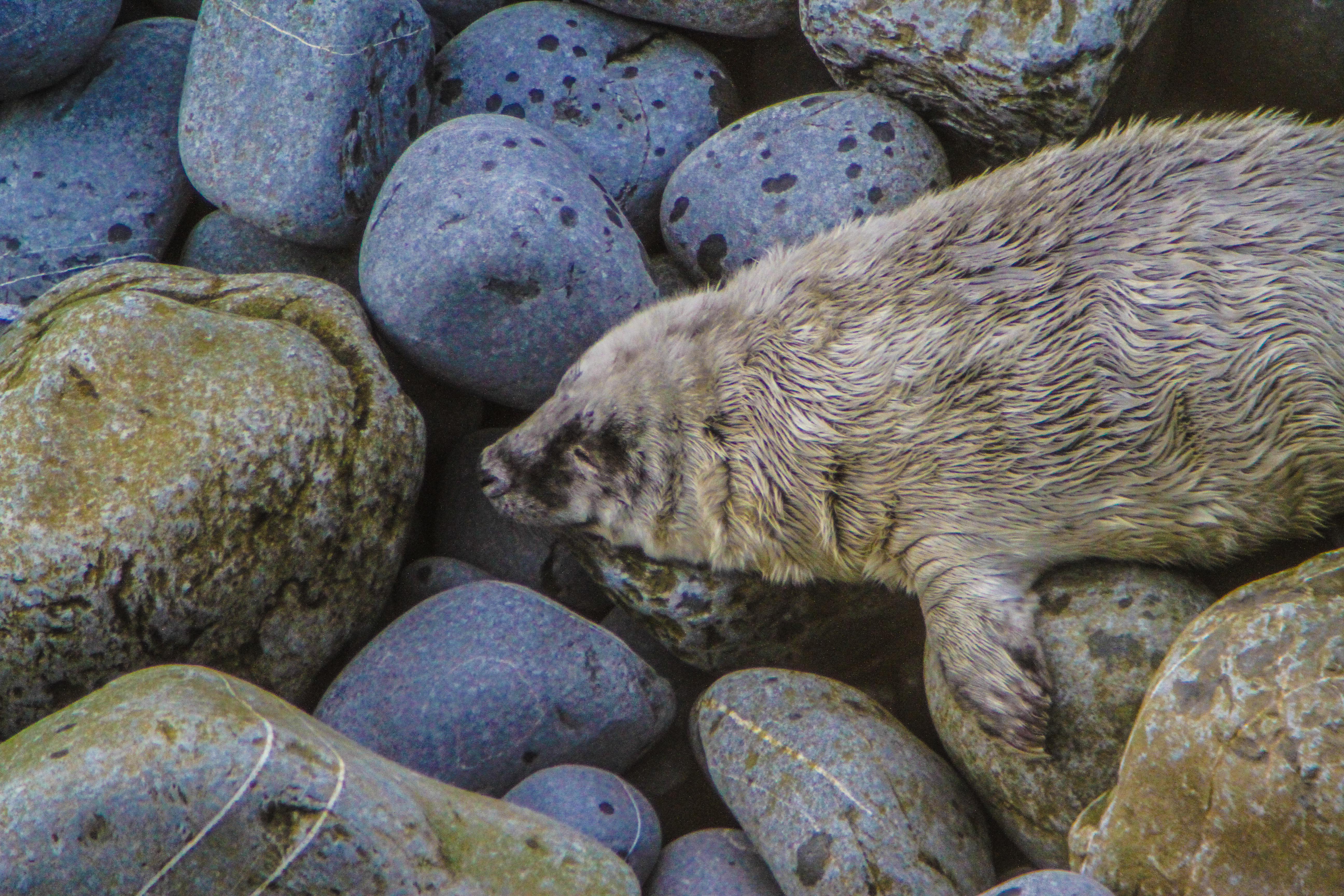 Having arrived a week ago, we have been welcomed and trained in land-based observations from the pier, line-transects and an array of office tasks. During last-weeks’ line-transect we had a number of sightings early in the day, including a group of 10 bottlenose dolphins which displayed interesting behaviour, which will be covered in a later blog. The new interns were not our only new arrivals, with a recently born grey seal pup being sighted atop a coastal rock.