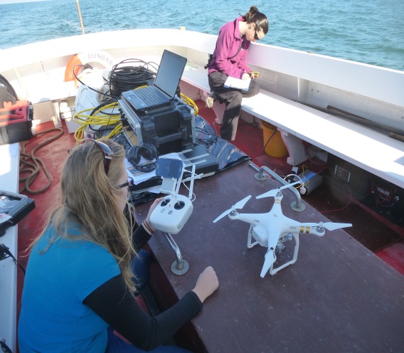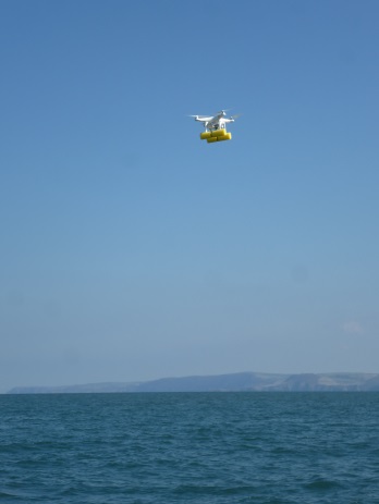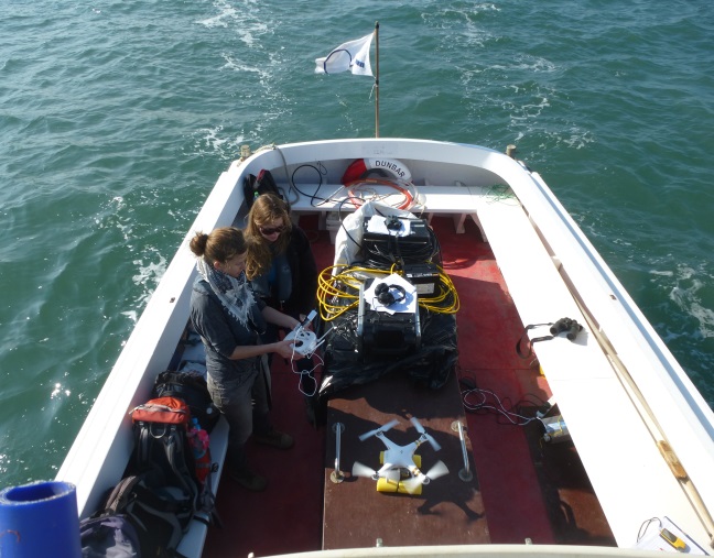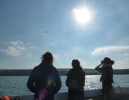 After several land trials, the team took “Shark Bait” out for its first spin overwater to get to grips with it whilst on the boat. We had a good-sized pod of dolphins between Aberporth and Mwnt consisting of five adults and three calves. Although the footage we obtained of the dolphins was not wonderful quality it gave us a good understanding of how we can use the drone over the dolphins and its potential in assisting our research within the Cardigan Bay Monitoring Project. Being able to take both still images and video footage also allows us to photograph the fins and film behaviour so that we can study it more easily. Click here for video footage taken of our first flight with “Shark Bait” whilst at sea.