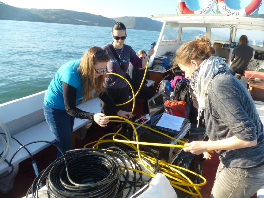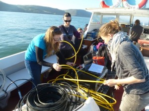 The new stereo towed hydrophone bought with the grant from Environment Wales has a built-in array for providing directionality so that the locations of individual vocalisations can be identified. It can also be left to record and store information over a period of time whilst the boat is moving so that it can be downloaded and analysed at a later date. This allows the team to tow the hydrophone along transects within Cardigan Bay so that they can accurately locate the presence of dolphins and particularly harbour porpoise within the bay without needing to see them. Recording the number of clicks and whistles then gives us an idea of what the animals are doing at the time that we located them.