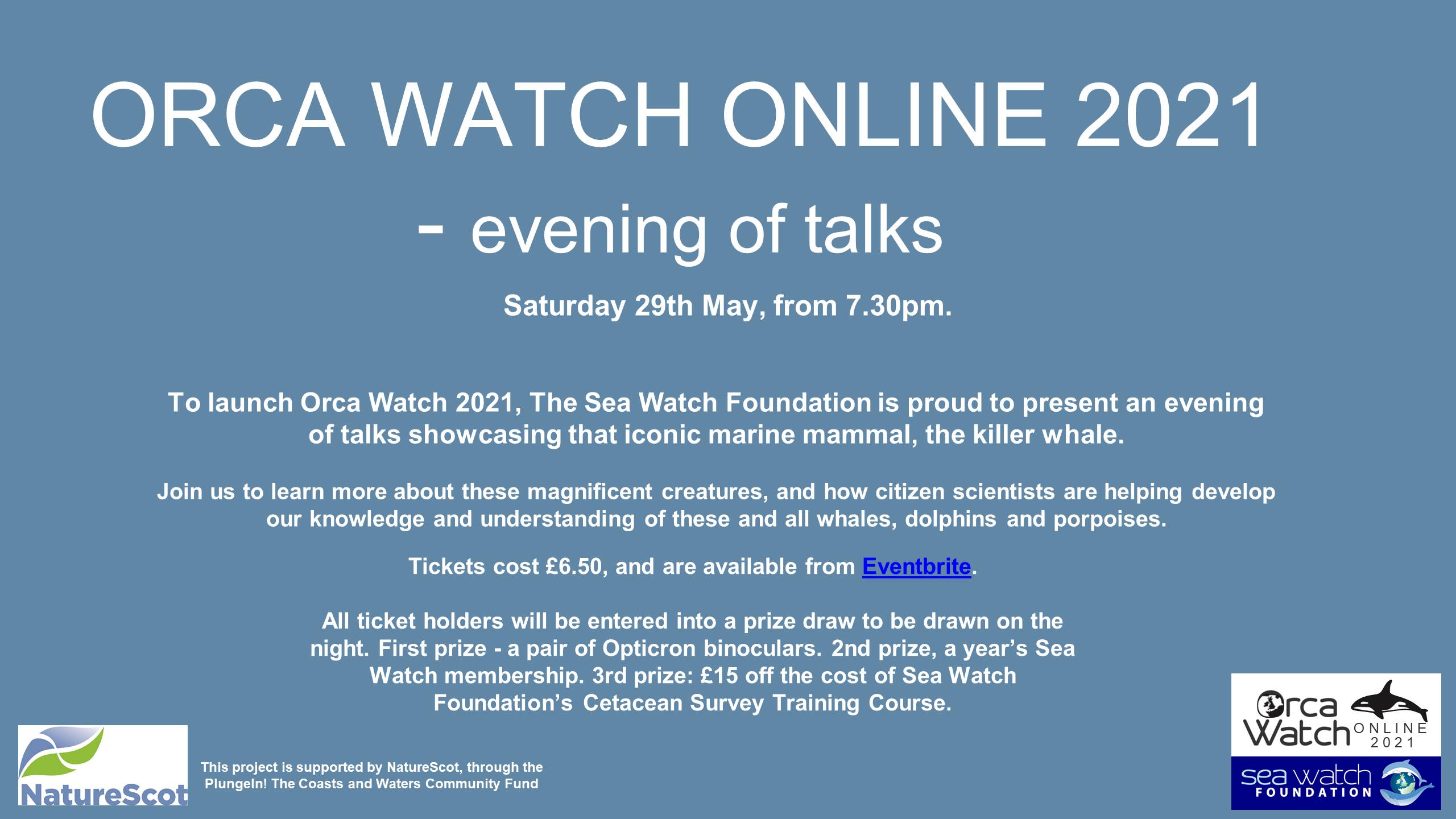 Orca Watch Online, held between May 29th and June 6th, will bring the excitement of watching orca in the UK to the comfort of your living room. The week-long programme of virtual events, talks, and daily sightings roundups will celebrate Orca Watch week 2021 whilst keeping the local community, wildlife enthusiasts, and Sea Watch staff safe. This year, the project is supported by NatureScot through the PlungeIn! The Coasts & Waters Community Fund.