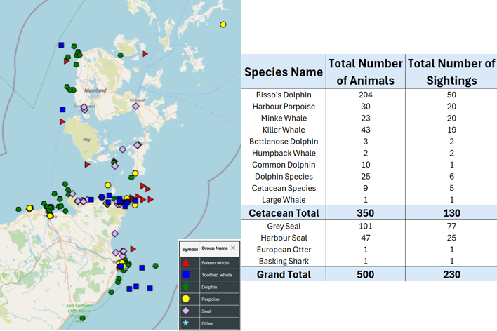 Orca Watch 2025 was the 12th year running this event, this year between the 24th of May to the 1st of June. During this time, trained volunteers surveyed from land and sea across the North of Scotland, recording any marine mammal spotted, with a focus on Killer whales or Orcas.