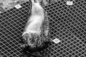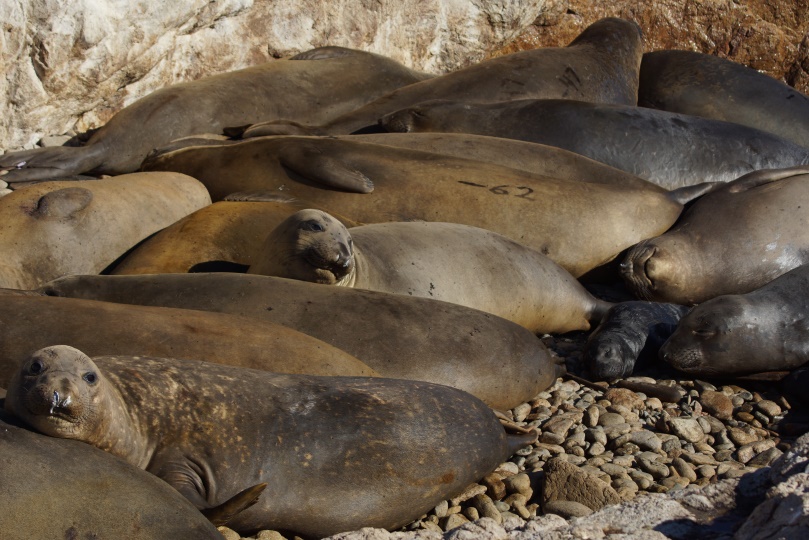 The research on the farallones is divided up into seasons, with spring and summer being occupied with hundreds of thousands of breeding sea birds, which leads into the autumn season researching song birds and white sharks. This brings us to the current season focussing on marine mammals from December to late March. Our primary research is on northern elephant seals, which give birth and breed in this time, and pups are weaned from the cows. Our typical day involves going down into the elephant seal colony to figure out which individuals have arrived, departed, moved, pupped, or lost their pup. This can take some time with 70 cows and 50 pups, but to help us we read tags in their flippers if present to track individuals throughout the years, and temporarily mark them to track them easily throughout the season. To mark them we use hair dye to either draw a number directly onto them, or use a pole to stamp it on. Using the stamp is often easier, especially in tightly packed areas, however writing on them whilst they are looking away or asleep is considerably less stressful, so we try to use that approach as much as possible. This approach works well, but is markedly different to those employed by SWF and many other researchers in the UK, which often use non-invasive techniques. These different techniques often use photo-identification to match pelage patterns of seal individuals to those in a catalog, similar to identifying individual dolphins by matching dorsal fin shape and scars. The target species is very different however, and each method has its benefits and suitable uses.