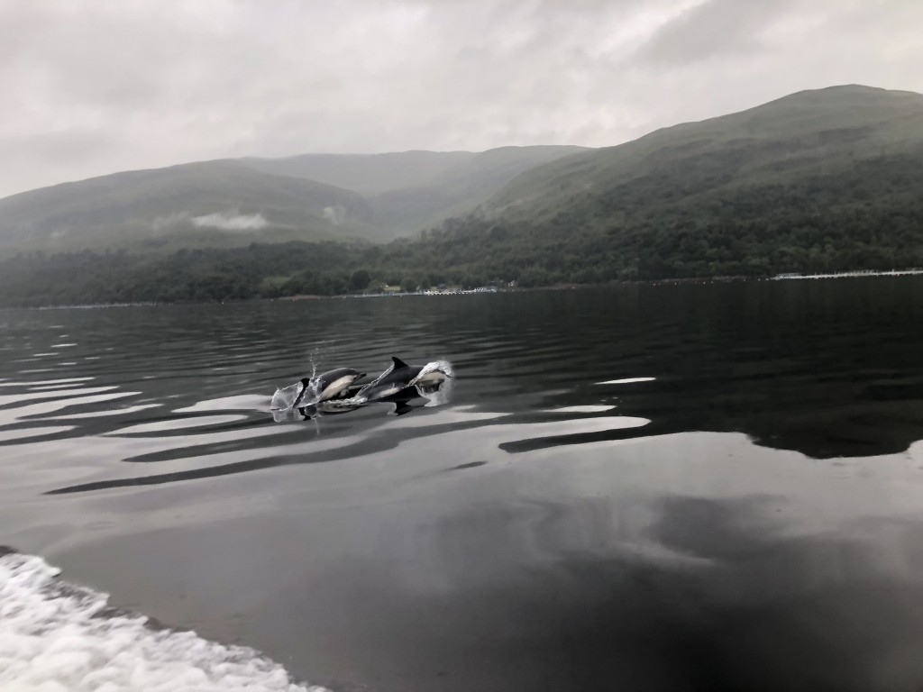We continued along the loch, it was a lovely still evening with the water like a mirror. As we approached Drimarben we saw the fins of the dolphins. There seemed to be one adult and a juvenile and they came to bow ride the boat.