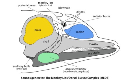 In toothed whales (the odontocetes, including dolphins, sperm whales, porpoises, and beaked whales), clicks are usually used for echolocation purposes (to navigate and make sense of their surroundings) whilst calls, whistles, and pulsed sounds are used socially. These sounds are producing using paired ‘phonic lip’ structures (otherwise known as monkey lips!) in their heads and nasal system, due to the fact that cetaceans lack a larynx, which produces sound in terrestrial mammals. Pressure builds up in this system due to the contraction of pharyngeal and nasal muscles, and the resulting movement of air through the system and past the phonic lips produces the sound. It is thought that toothed whales might not use the paired lips together to produce the same sound, but instead use one side for clicking and the other for whistles (Madsen et al., 2013).