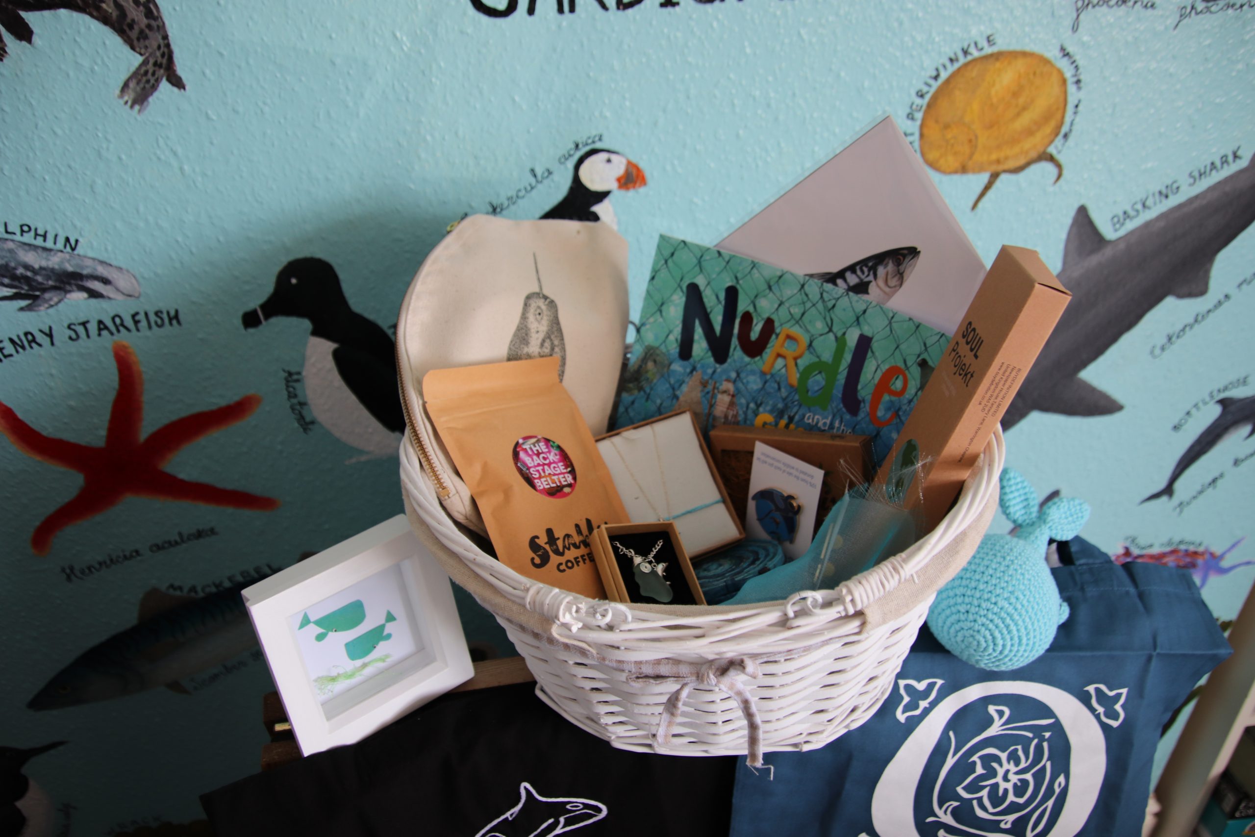 Raffle prizes: GiftWild cosmetics bag, Lizzie’s Crochet Shop crochet whale, Ivory Ocean t-shirt, Smartie Lids on the Beach artwork, OchotosHands recycled material coasters, Sarah Whittle artwork, HatchlingMakes pins, Digg Designs tote bag, Soul Projekt reusable straws, Ocean Embroidery tote bag, Stables Coffee Co coffee, Small Kind beauty box, Claire Vowedell Nurdle children’s books, Pineapple Island jewellery, Copper Rainbow seaglass necklace and Welsh Sisters gin