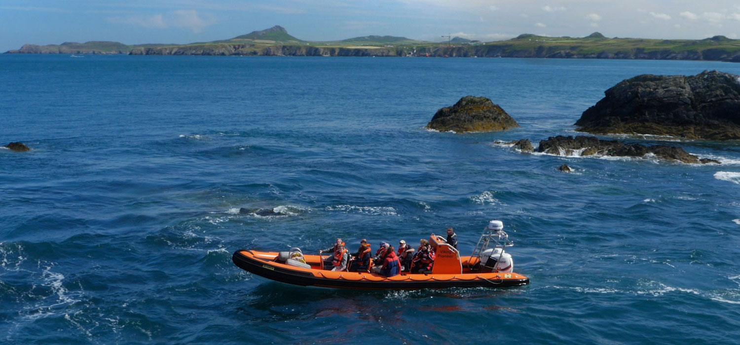 We provide a range of professionally guided wildlife boat tours in Britain’s only coastal national park. Our vessel is a purpose built 10m rigid hull inflatable boat. Join us to experience unforgettable close encounters with seals, porpoise and dolphins as well as myriads of nesting seabirds and spectacular scenery. Likely species to be seen include common and Rissos dolphin, harbour porpoise, minke whale; Gannets, shearwaters, storm petrels, guillemots, razorbills, puffins, kittiwake, fulmars as well as lots of resident birds; Atlantic grey seals, sunfish, basking shark, jelly fish. Due to our remote location on the western tip of Wales we also often sea migratory birds such as skuas, terns, sooty shearwaters and many other species.